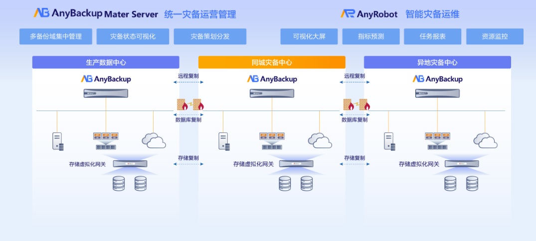 兩地三中心包含三個數(shù)據(jù)中心,首先是客戶的生產數(shù)據(jù)中心,然後是在距離生產數(shù)據(jù)中心較近的地理位置(一般同城或臨近城市建設),第三個是異地災備中心,當生產數(shù)據(jù)中心與同城災備中心在遭遇大型自然災害,導致區(qū)域性的業(yè)務停止運行時,異地的災備中心就可以提供數(shù)據(jù)的恢復操作,來保障數(shù)據(jù)不丟失,業(yè)務可恢復。兩地三中心災備的建設需要三個災備節(jié)點,基於這種設計模式,我們會提供一個整體的管理平臺,也就是AnyBackup Master Server(簡稱 AMS),來進行兩地三中心災備的可視化管理,這也是降低運維複雜性的...